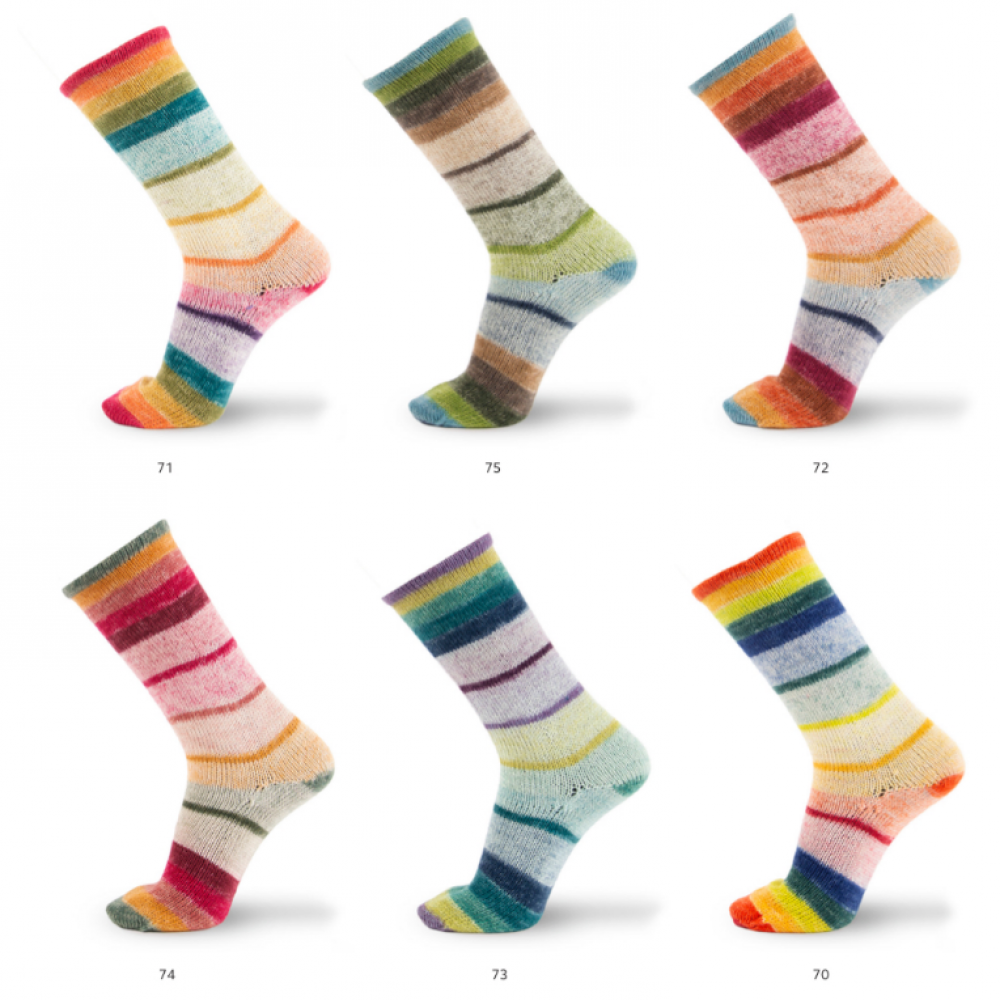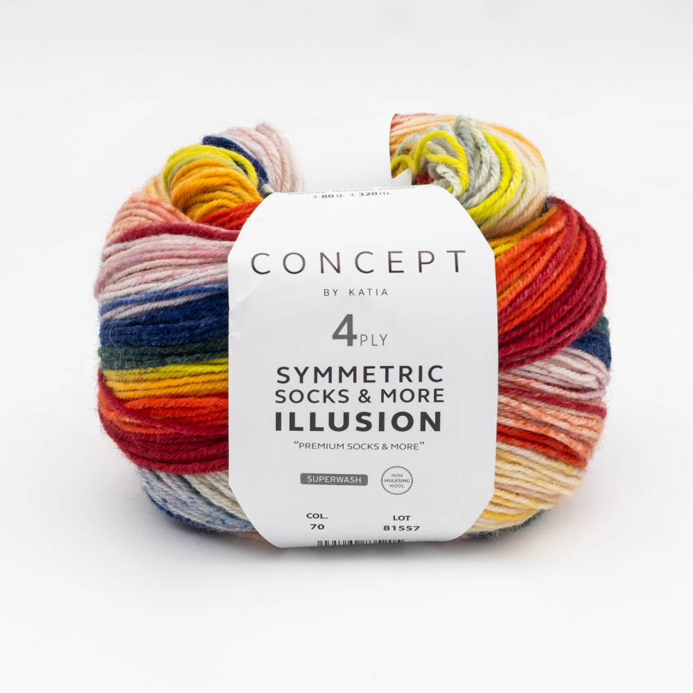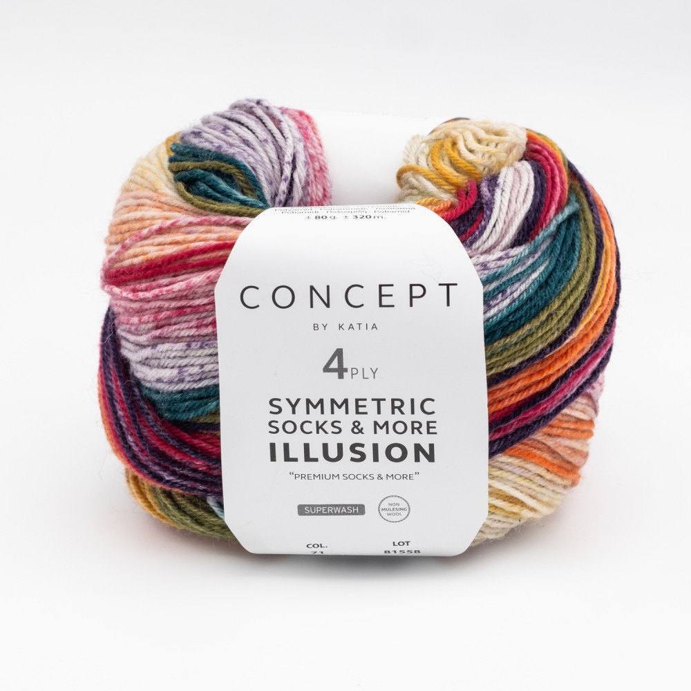 Добавьте цвета своим носкам с помощью Concept Illusion Symmetric Socks & More, инновационной 4-слойной пряжи с идеально повторяющимся рисунком. Её игривый цветовой эффект сочетает в себе смелые полосы с гармоничным градиентом, что делает его идеальным для вязания уникальных носков. Кроме того, с помощью всего одного мотка вы можете легко связать элегантный снуд. Наслаждайтесь созданием ярких и стильных аксессуаров.